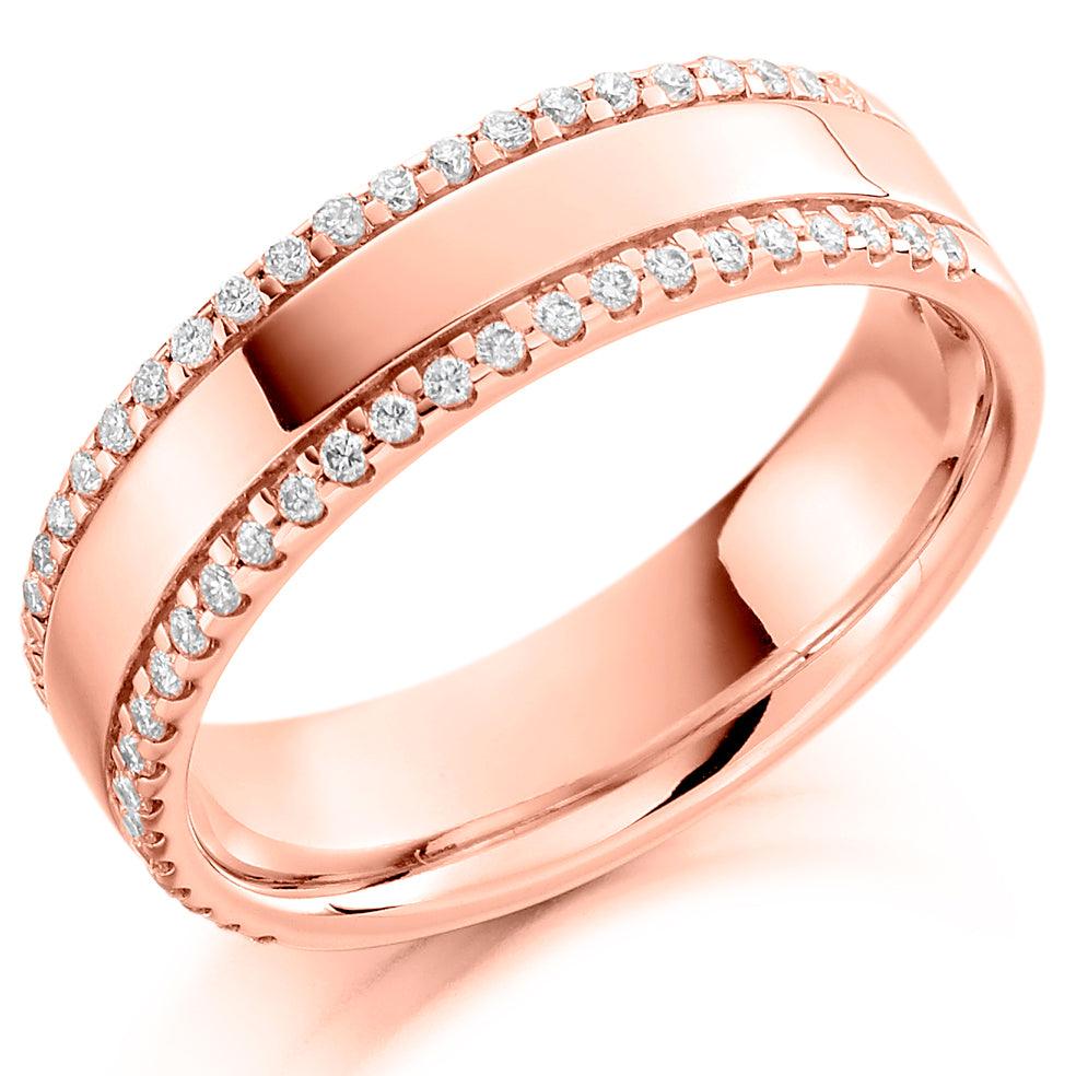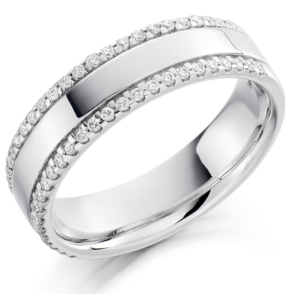 This beautiful eternity ring has two rows of micro claw set brillaint cut diamonds and is also suitable to wear on your right hand as a dress ring, in the colour of your choice. Comes with a stamped hallmark.