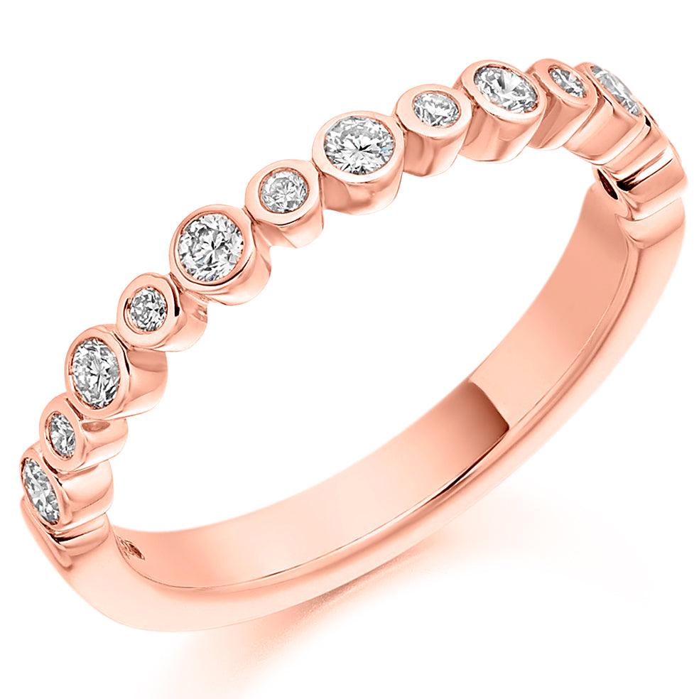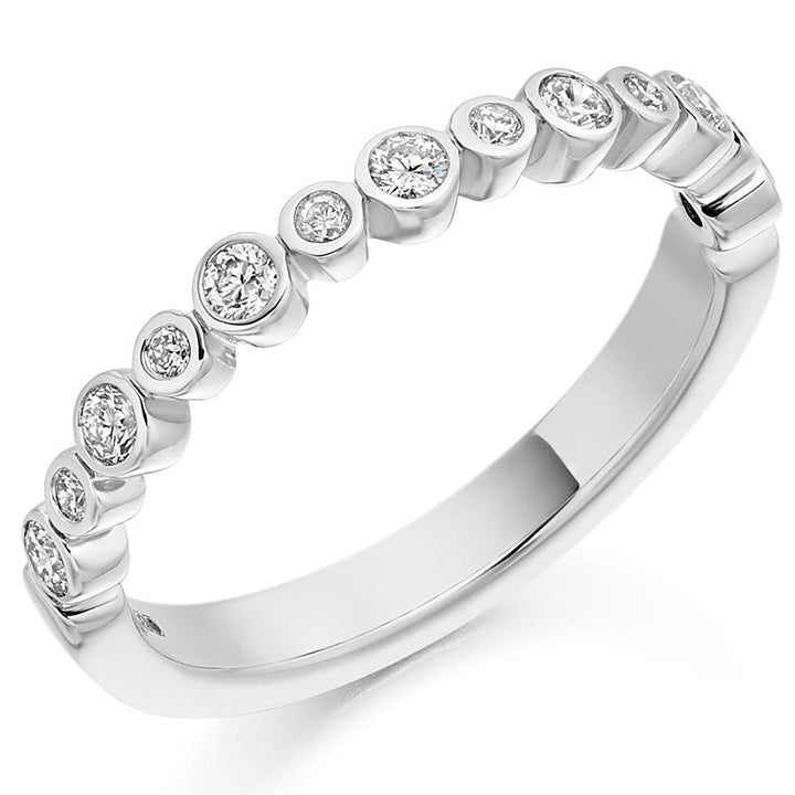 This pretty rubover set half eternity ring with brilliant cut diamonds, in the colour of your choice. Comes with a stamped hallmark.