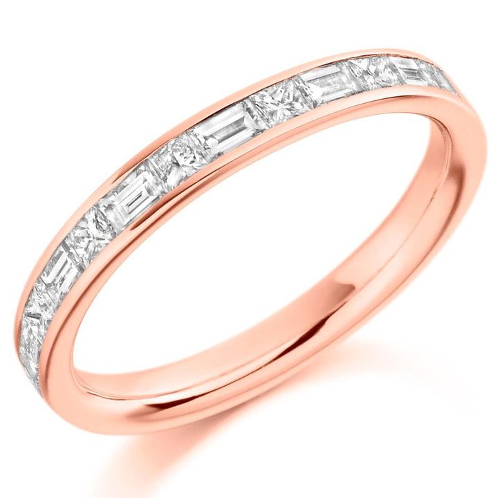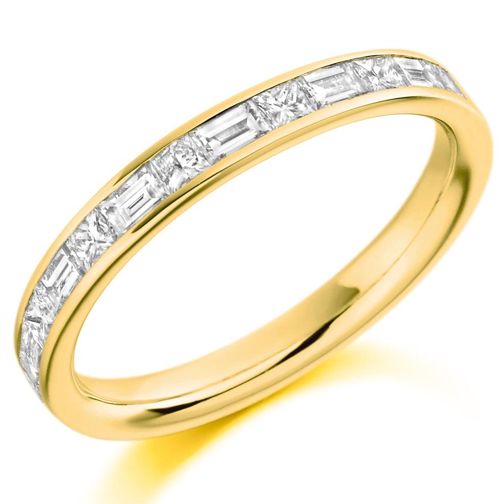 This beautiful half eternity ring is channel set with alternating princess and baguette cut diamonds in a classic band, in the colour of your choice. Comes with a stamped hallmark.