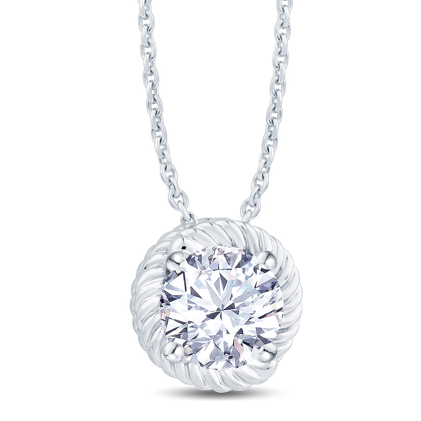 This elegant pendant showcases a 0.70ct laboratory-grown round brilliant diamond, encircled by a sophisticated swirling rope design. It boasts an E Colour and VS Clarity diamond, highlighting exceptional quality and brilliance. Accompanied by a complimentary trace chain.