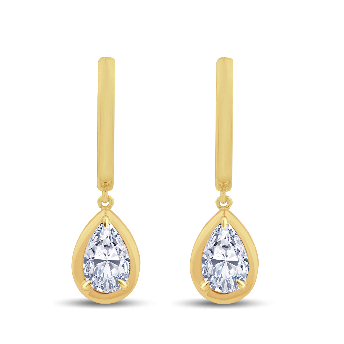 These sophisticated drop earrings feature a combined total of 1.21ct of laboratory-grown diamonds, each expertly set within a sleek, minimalist 18ct gold design. Uniquely detailed with a concealed halo of diamonds encircling each earring, they display remarkable craftsmanship. Graded E Colour and VS Clarity, these earrings exemplify superior quality and outstanding sparkle.