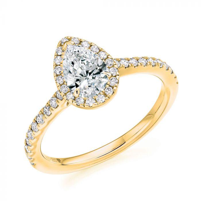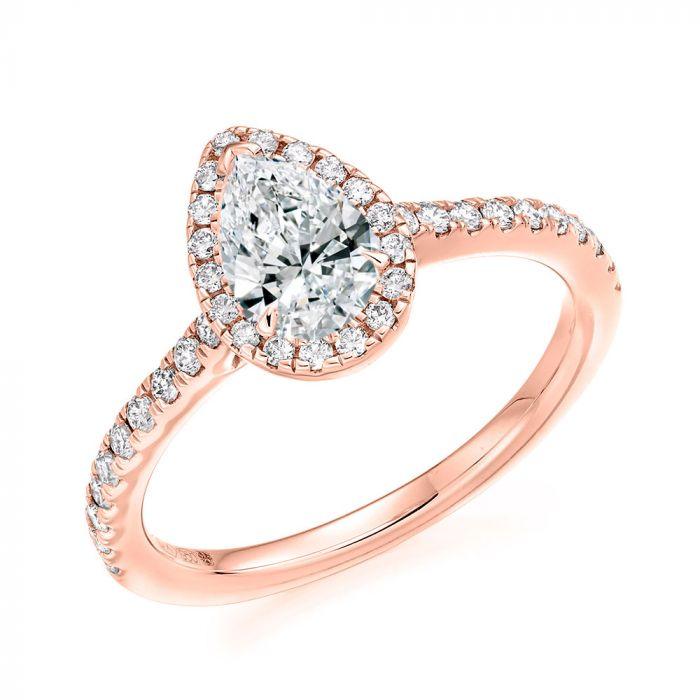 These delicate vintage style engagement rings feature a single row of round brilliant cut micro pavé diamonds set in a halo that perfectly frames the pear cut centre diamond of your choice.