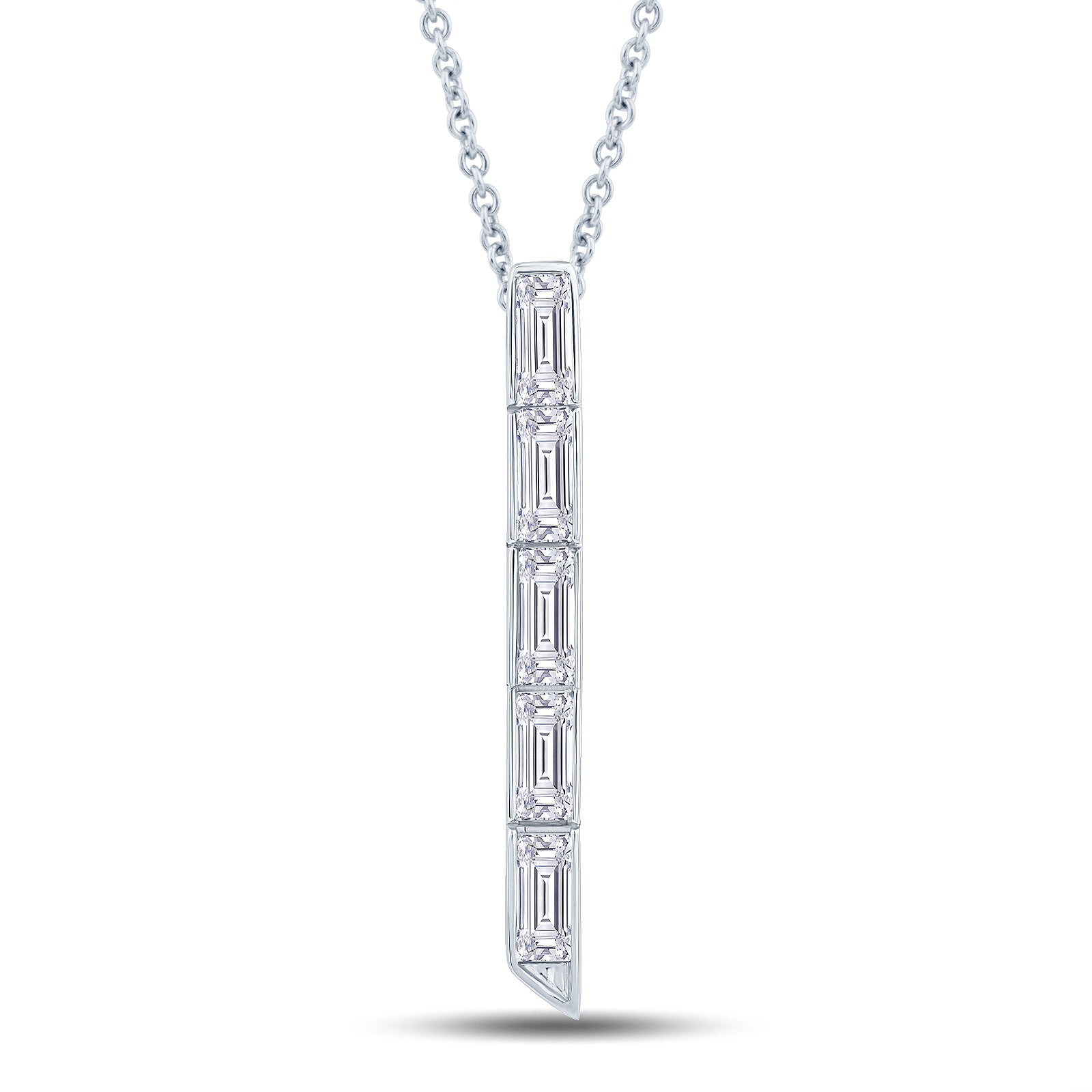 Crafted in 18ct white gold and set with 0.40ct of emerald-cut laboratory-grown diamonds graded E colour and VS clarity, this pendant delivers superior brilliance and sparkle. The contemporary bamboo motif creates a striking aesthetic that balances elegance with modern design sensibility. Discover coordinating pieces including our bamboo earrings and alternative necklace options to curate a cohesive collection. Shop the Bamboo Collection.