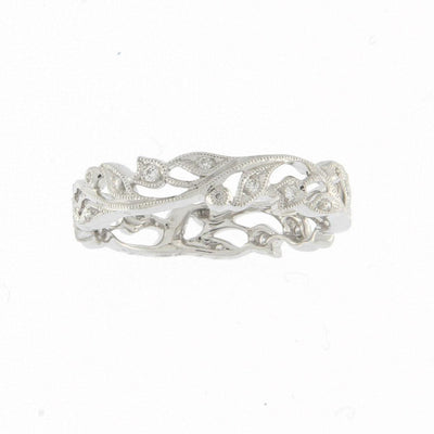 This gorgeous 18ct white gold ring is millgrain set with brilliant cut diamonds with a total weight of 0.11ct. The floral design is inspired by the intertwining leaves of a vine.