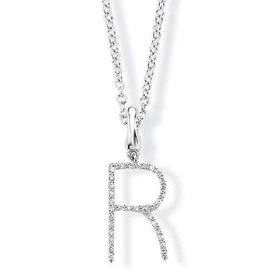 This fashionable and fun 18ct white gold initial R pendant is set with approximately 0.10ct diamonds. Measuring approximately 8mm x 20mm it comes with an 18 inch chain.