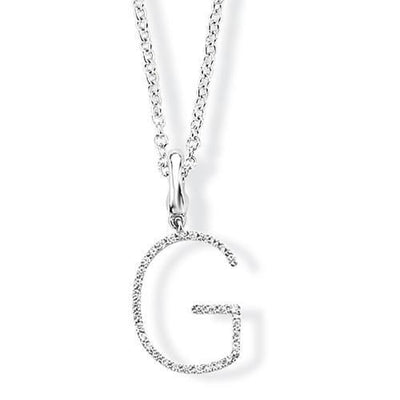 This fashionable and fun 9ct white gold initial G pendant is set with approximately 0.08ct diamonds. Measuring approximately 10 x 18mm it comes with an 18 inch chain