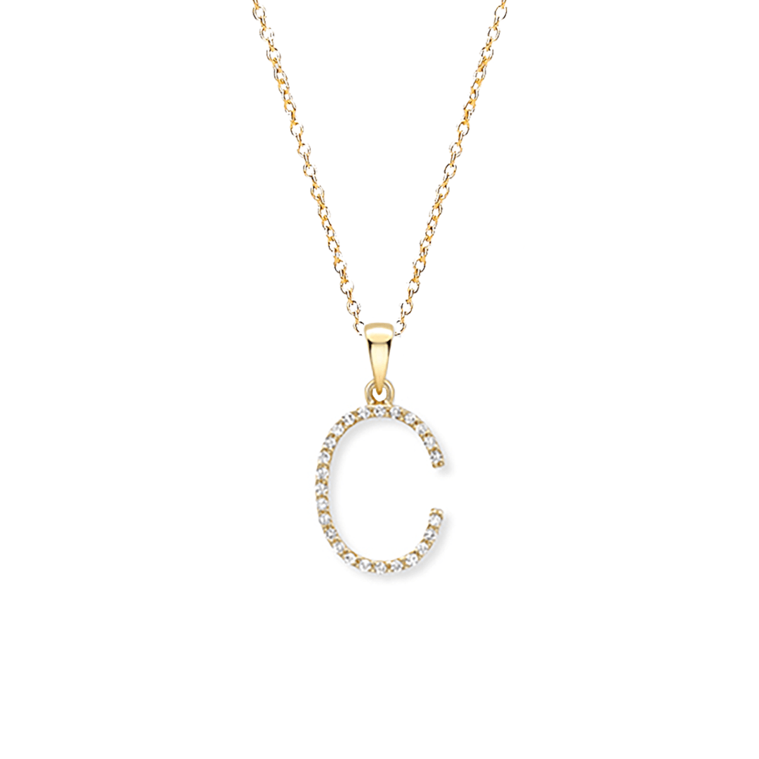 This fashionable and fun 9ct yellow gold initial C pendant is set with approximately 0.04ct diamonds. Measuring approximately 7 x 18mm it comes with an 18 inch chain.