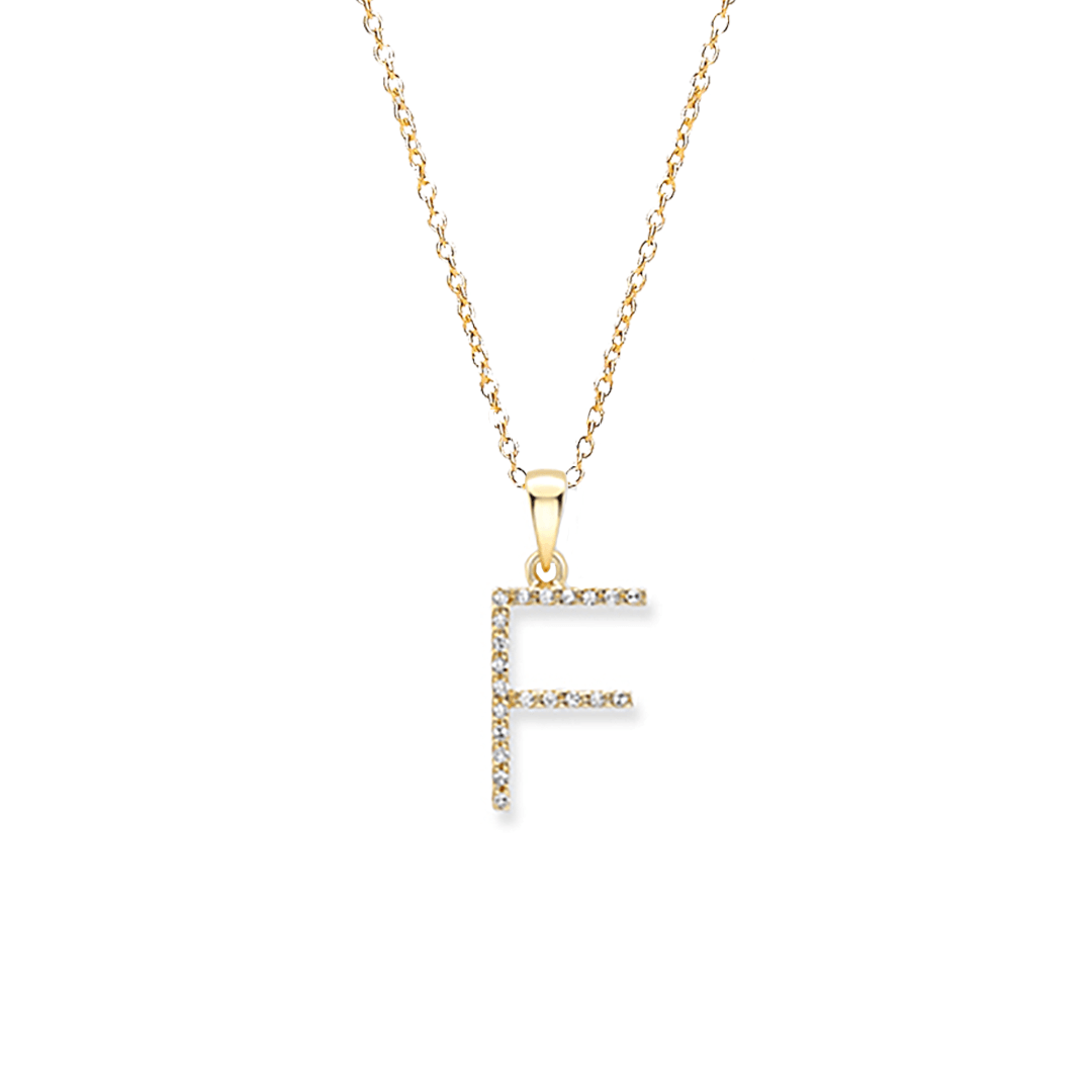 This fashionable and fun 9ct yellow gold initial F pendant is set with approximately 0.04ct diamonds. Measuring approximately 7 x 18mm it comes with an 18 inch chain.