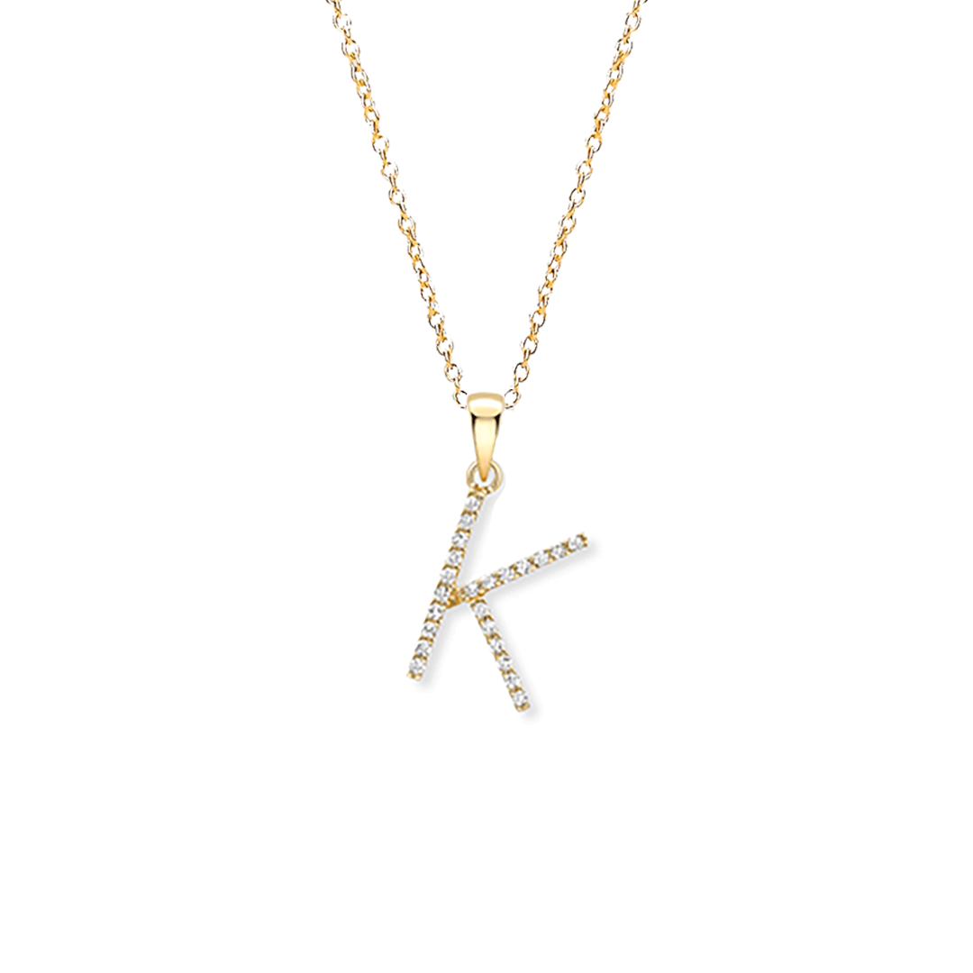 This fashionable and fun 9ct yellow gold initial K pendant is set with approximately 0.04ct diamonds. Measuring approximately 7 x 18mm it comes with an 18 inch chain.