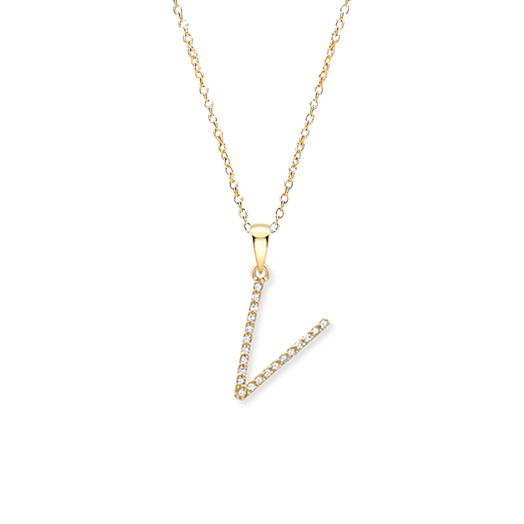 This fashionable and fun 9ct yellow gold initial V pendant is set with approximately 0.04ct diamonds. Measuring approximately 7 x 18mm it comes with an 18 inch chain.