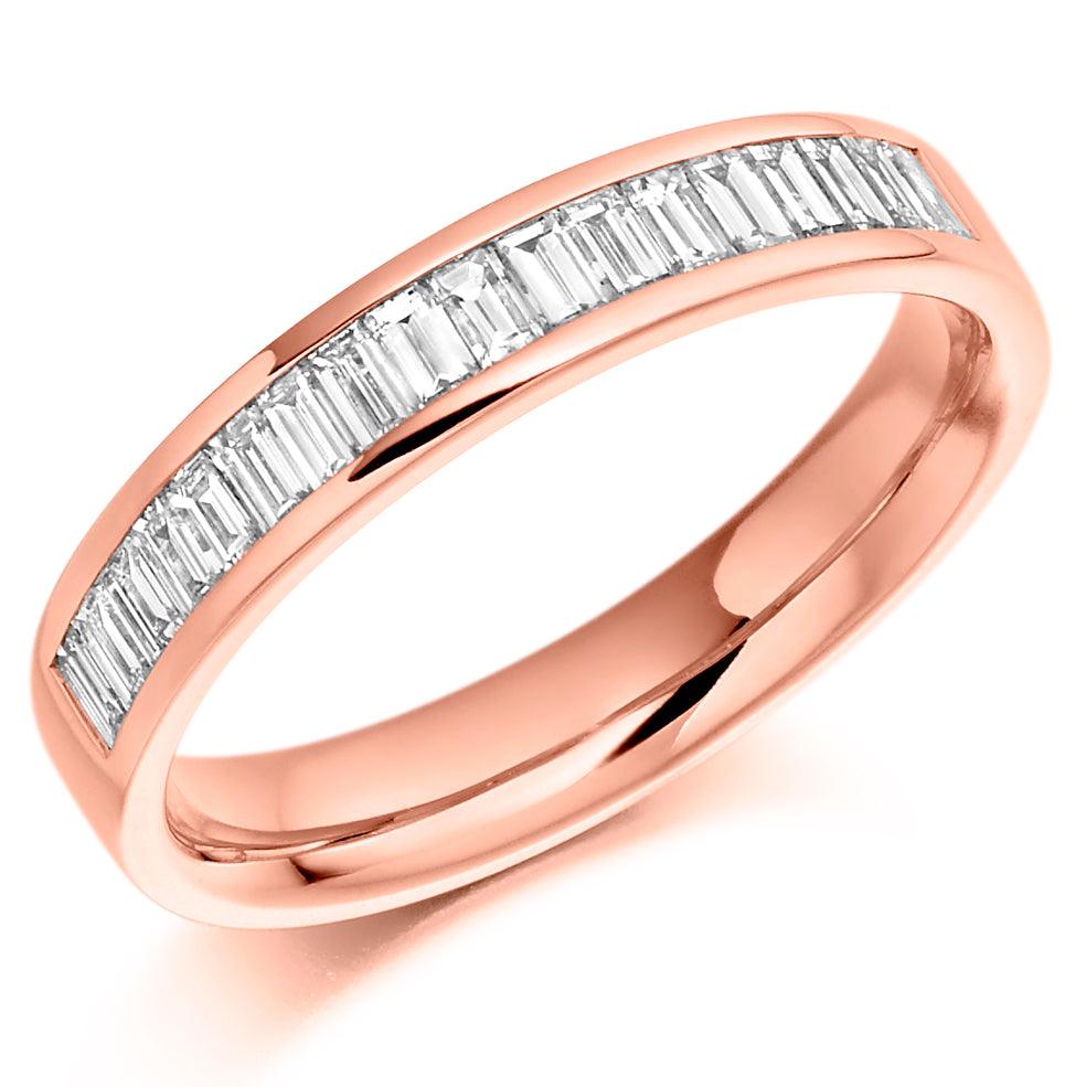 This gorgeous half eternity ring features a row of baguette cut diamonds channel set in a delicate band, in the colour of your choice. Comes with a stamped hallmark.