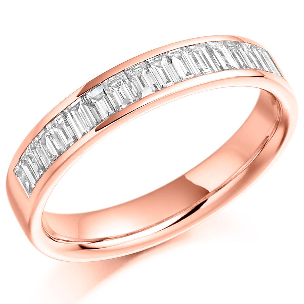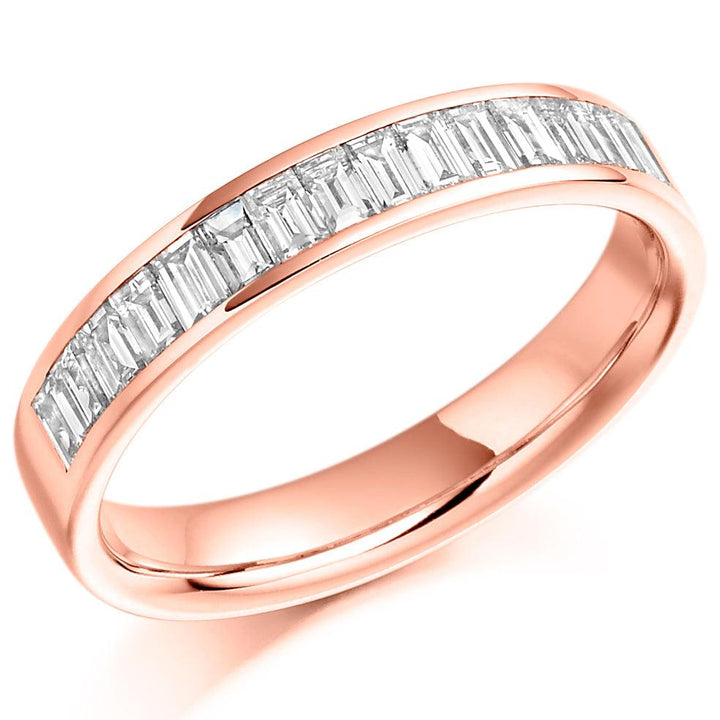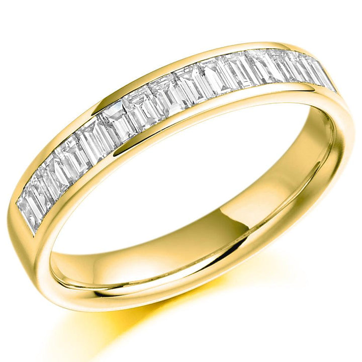 This gorgeous half eternity ring features a row of baguette cut diamonds channel set in a delicate band, in the colour of your choice. Comes with a stamped hallmark.