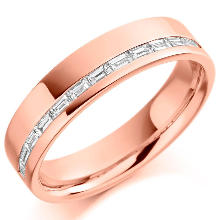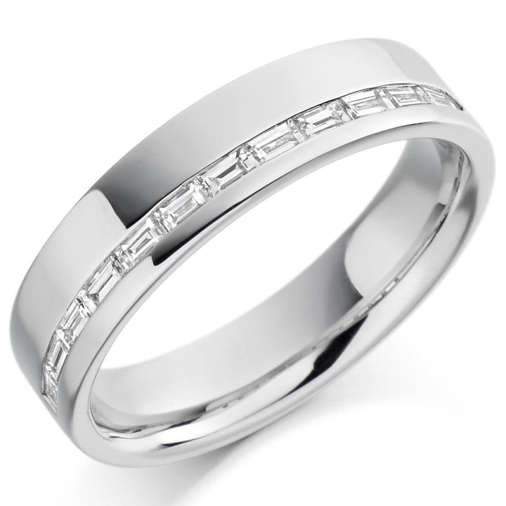 This bold and beautiful eternity ring is channel set with a single row of baguette cut diamonds, in the colour of your choice. Comes with a stamped hallmark.