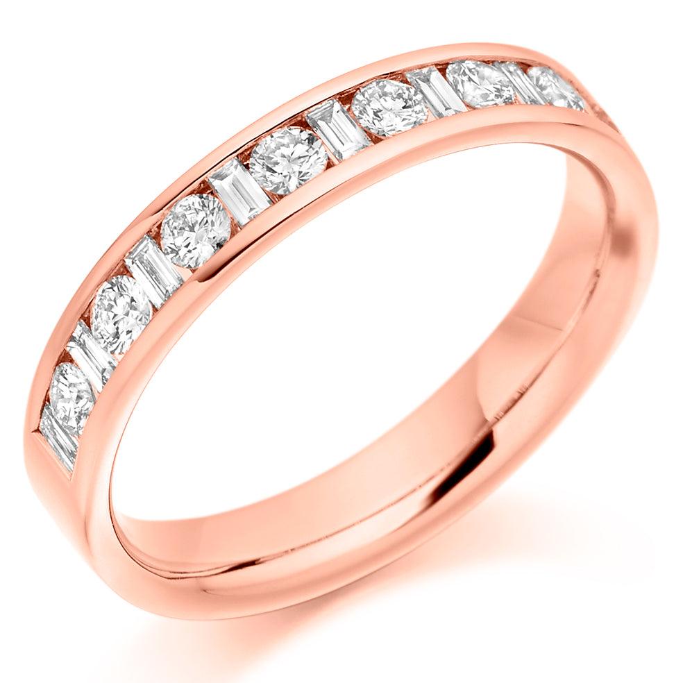This eternity ring is channel set with alternate round brilliant and baguette cut diamonds in a delicate band in the colour of your choice. Comes with a stamped hallmark.