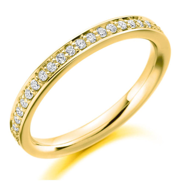 This beautiful half eternity ring is grain set with a single row of round brilliant cut diamonds in a delicate band, in the colour of your choice. Comes with a stamped hallmark.