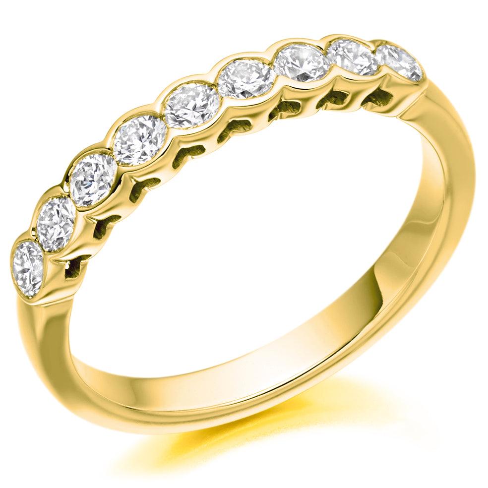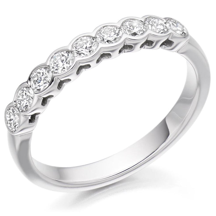 This stunning eternity ring is rubover set half eternity ring with brilliant cut diamonds, in the colour of your choice. Comes with a stamed hallmark.