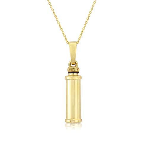 A meaningul and functional cynlinder style bottle pendant with a secure top on a fine chain. This piece is elegantly designed as a keepsake or personal memento, always keeping it close to your heart. Comes in the colour of your choice.