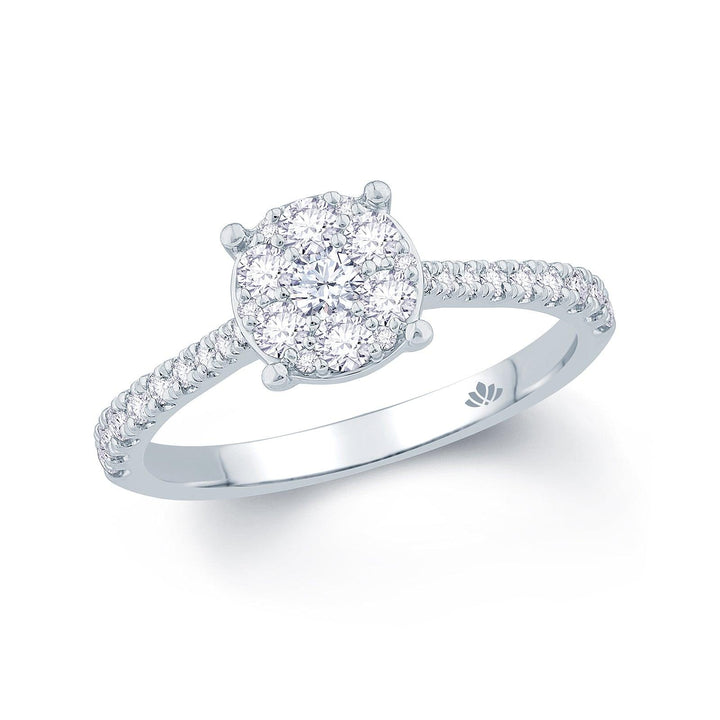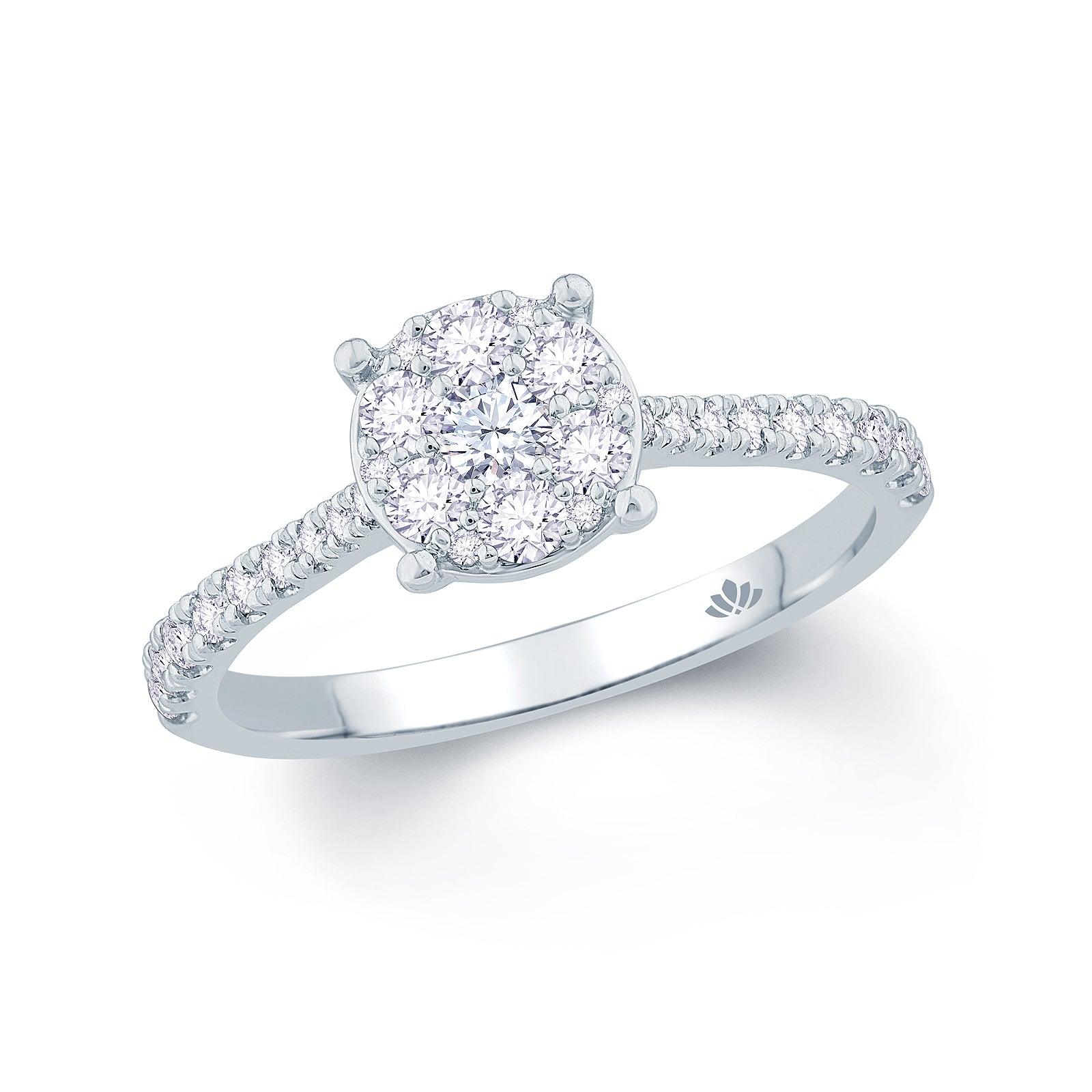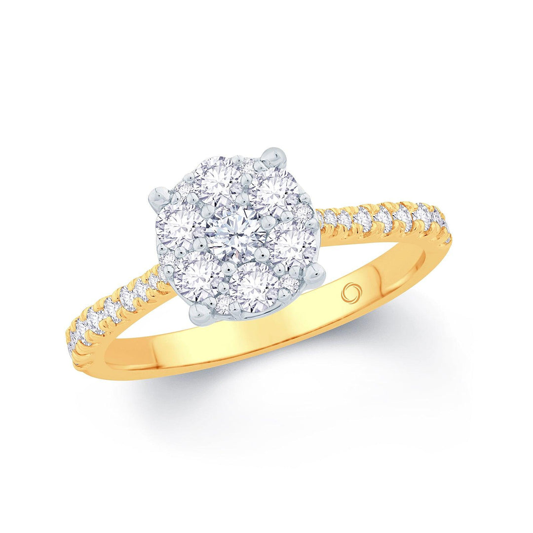This beautiful engagement ring is set with sparkling brilliant cut diamonds in a cluster effect and shoulders, in the diamond size and colour of your choice