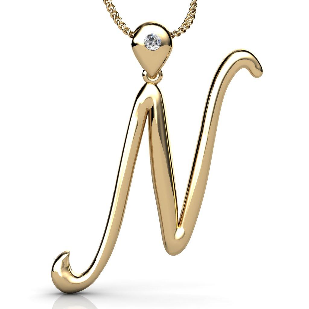 This gorgeous Initially Yours N pendant and chain is designed and manufactured in our own workshop. The pendant loop is invisible set with a sparkling 0.015ct round brilliant cut diamond and carved on the reverse is a tiny intricate heart. The chain is an 18" spiga style which sets the pendant off beautifully, in the metal of your choice.