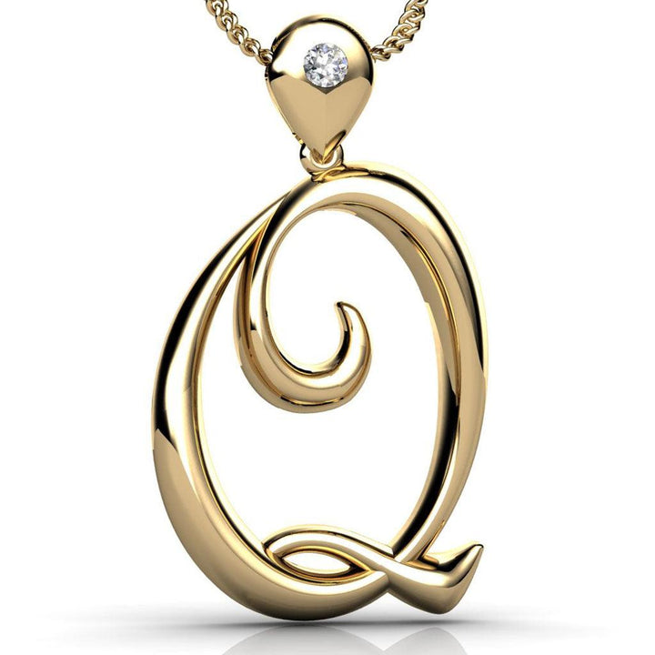 This gorgeous Initially Yours Q pendant and chain is designed and manufactured in our own workshop. The pendant loop is invisible set with a sparkling 0.015ct round brilliant cut diamond and carved on the reverse is a tiny intricate heart. The chain is an 18" spiga style which sets the pendant off beautifully, in the metal of your choice.