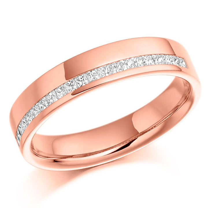 This delicate half eternity ring is channel set with princess cut diamonds offset to one side of this stunning band, in the colour of the choice. Comes with a stamped hallmark.