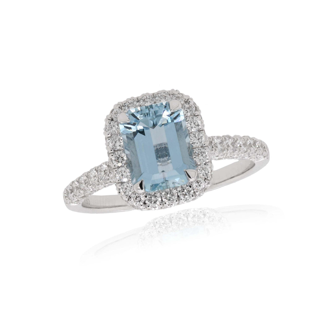This beautiful 18ct white gold ring is set with a stunning 1.25ct aquamarine centre stone accompanied by 1.16ct diamond halo and shoulders.