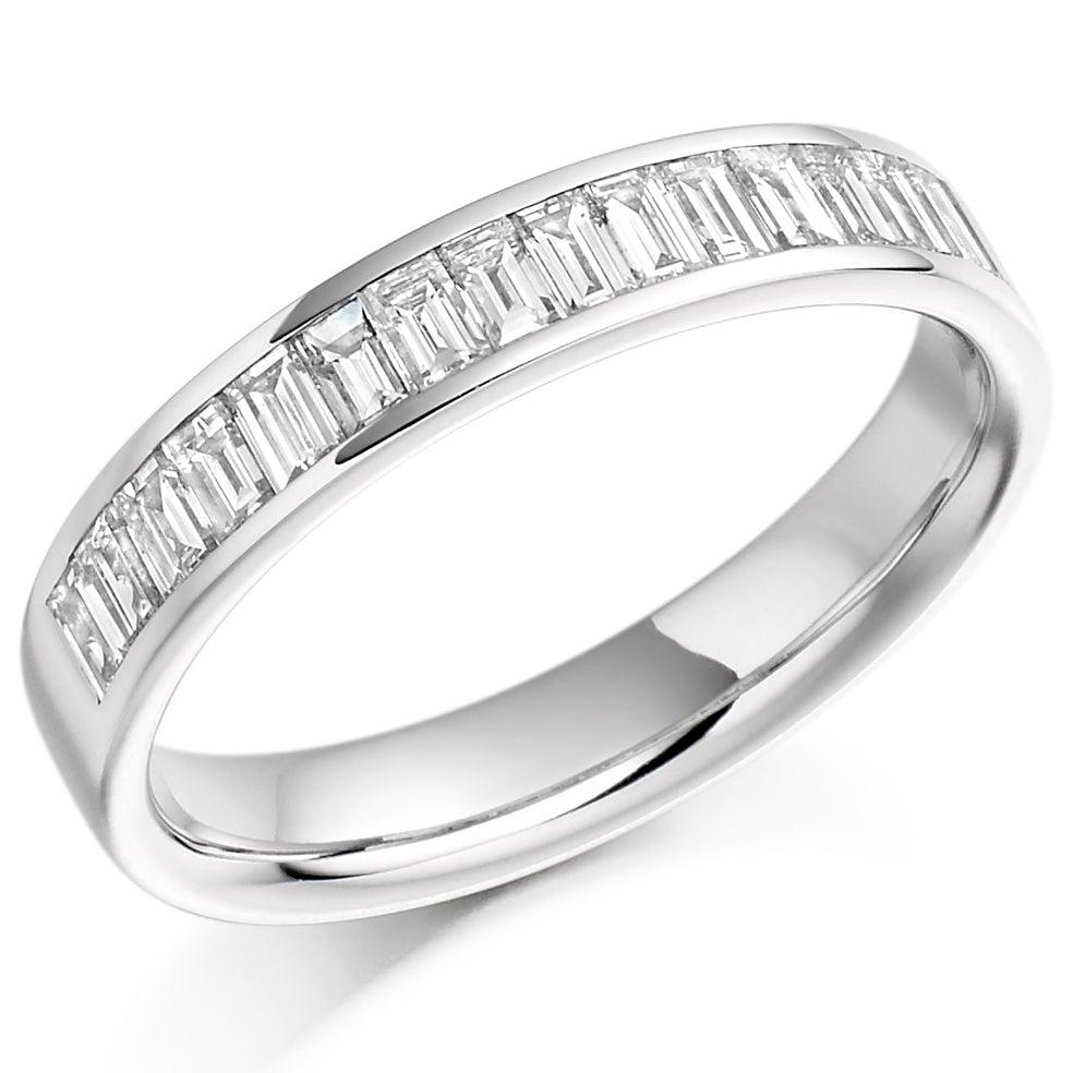 This gorgeous 18ct white gold half eternity ring features a row of baguette cut diamonds channel set in a delicate band, weight a total carat weight of 0.76ct. Comes with a stamped hallmark.