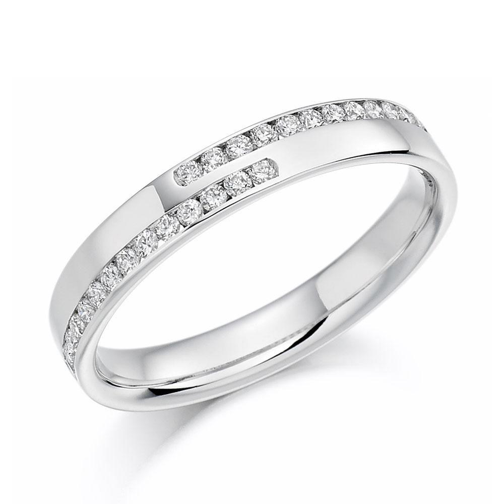This beautiful 18ct white gold ring has two rows of channel set brilliant cut diamonds which overlap to produce this stunning band, with a total carat weight of 0.25ct
