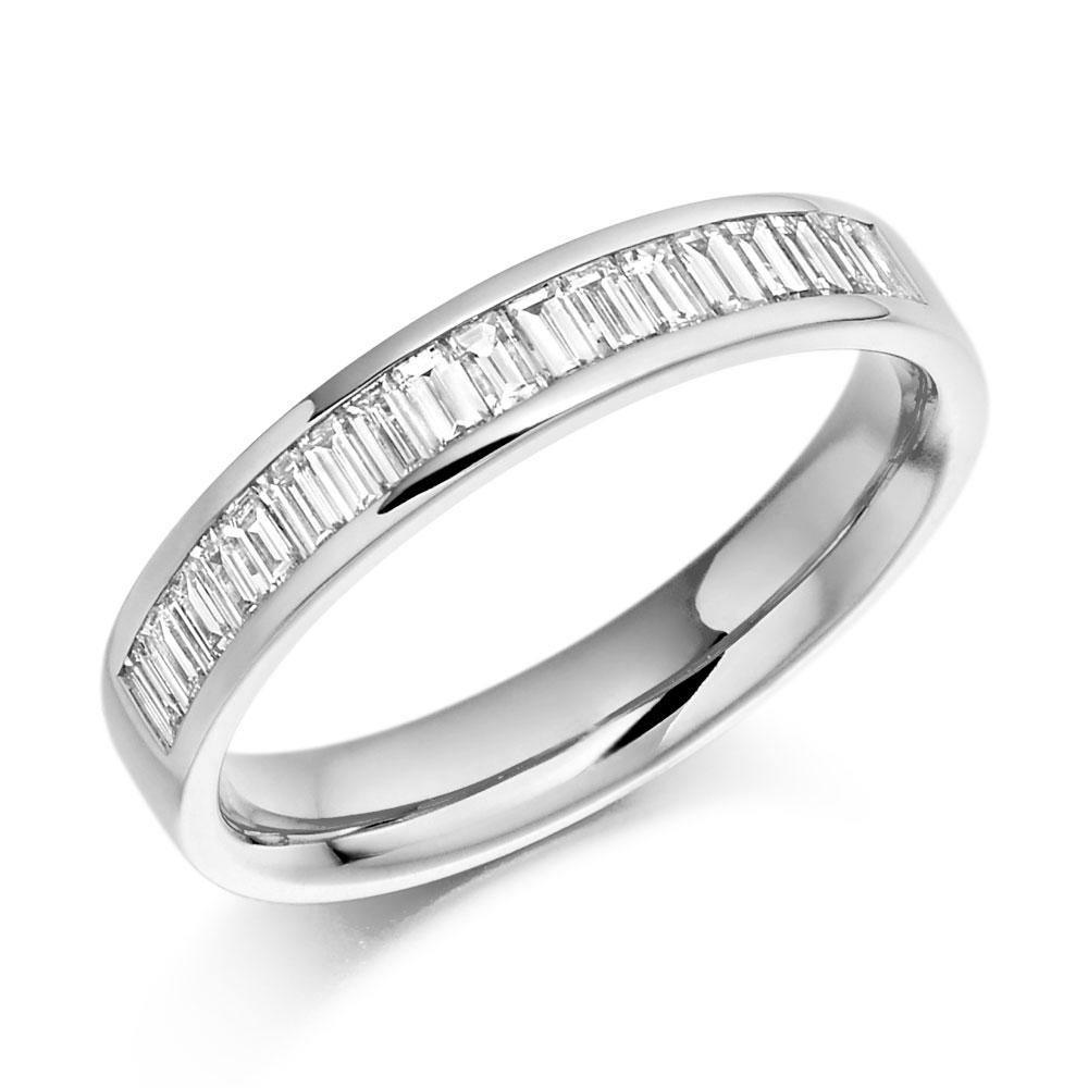 This gorgeous 18ct white gold half eternity ring features a row of baguette cut diamonds channel set in a stunning band, with a total carat weight of 0.56ct. Comes with a stamped hallmark.